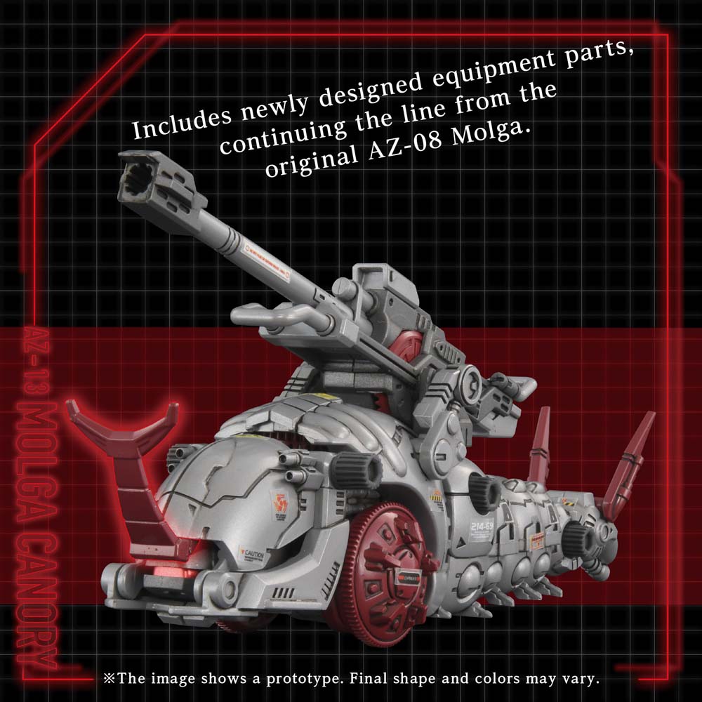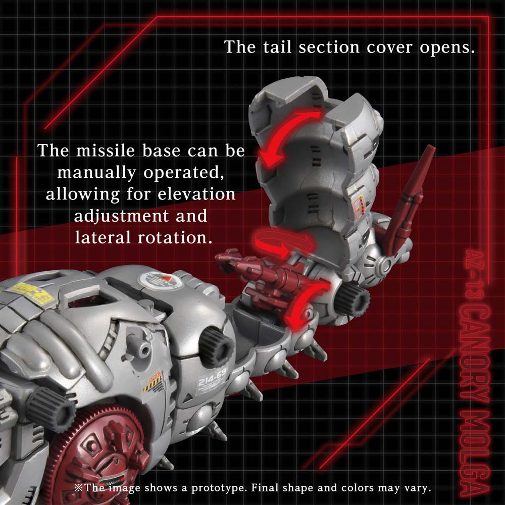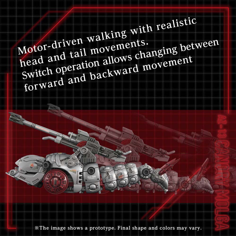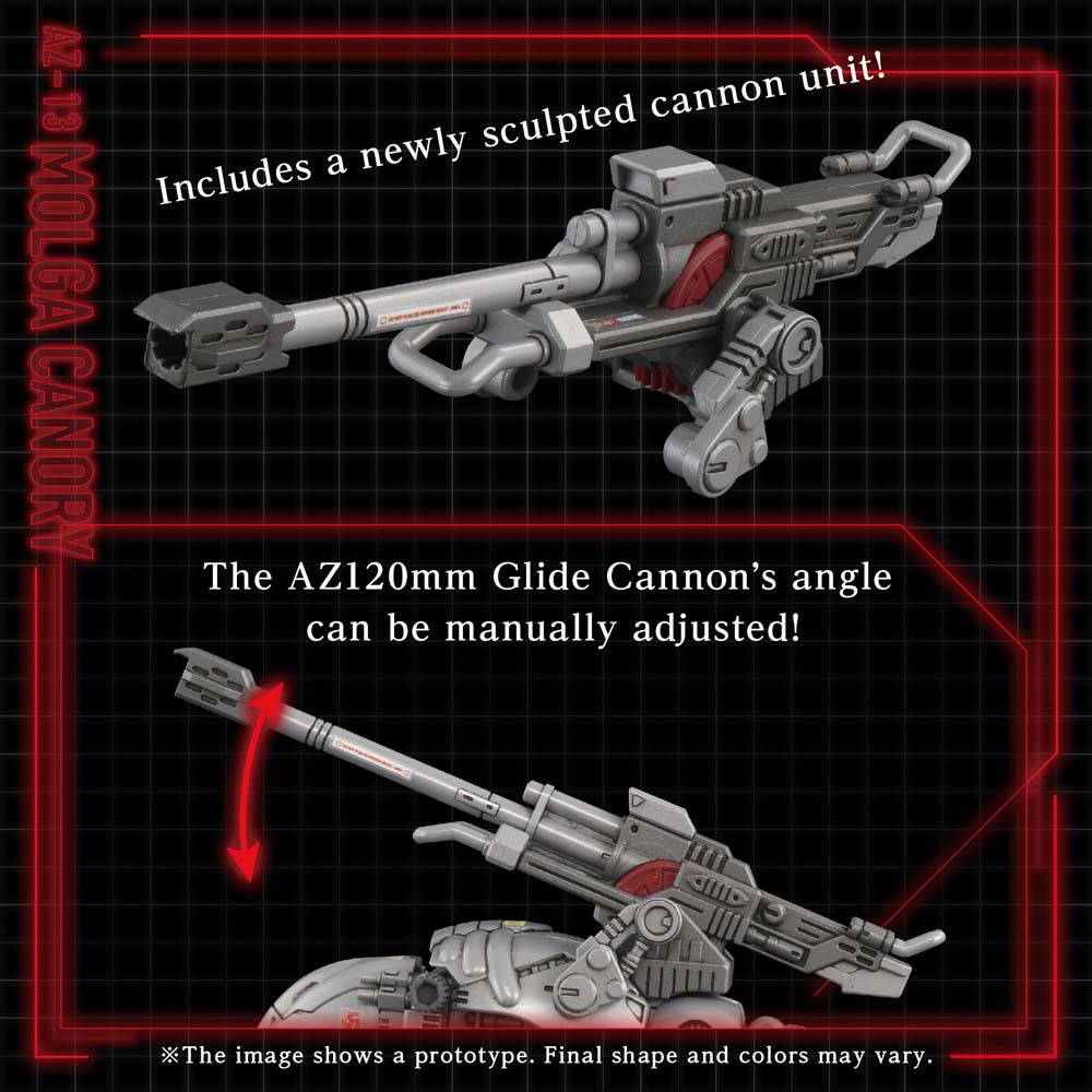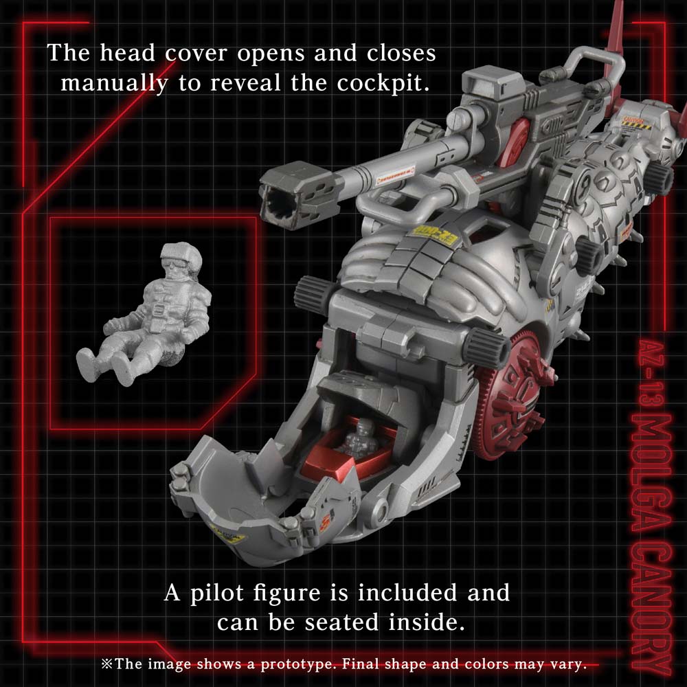 Flip the switch on the electric unit and watch it replicate the unique, crawling movement that this insect-type Zoid is known for. The Molga’s main body features a gear-linked mechanism that transmits power to the back, allowing the glide cannon to perform motorized actions in perfect synchronization. This model includes a newly sculpted cannon unit and comes with a 1/72-scale regular soldier figure that can board the cockpit for added realism.