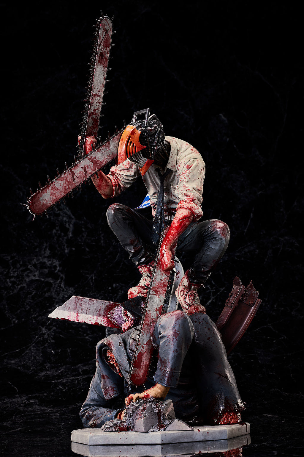 World-famous sculptor Takayuki Takeya designed and sculpted this incredible figure of Chainsaw Man from the TV anime of the same name! This display piece is loaded with details from the ground up, from Chainsaw Man's powerfully coiled body and impressive chainsaws to the brutally disassembled samurai sword demon that forms his base.