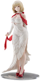 Her elegant pure white dress is an original design exclusive to FURYU. Every detail—from the choker and chest ornamentation to the feathers adorning the hem—has been meticulously sculpted with great care. The vivid red high heels pop against the simple color palette, further enhancing Falin’s beauty.