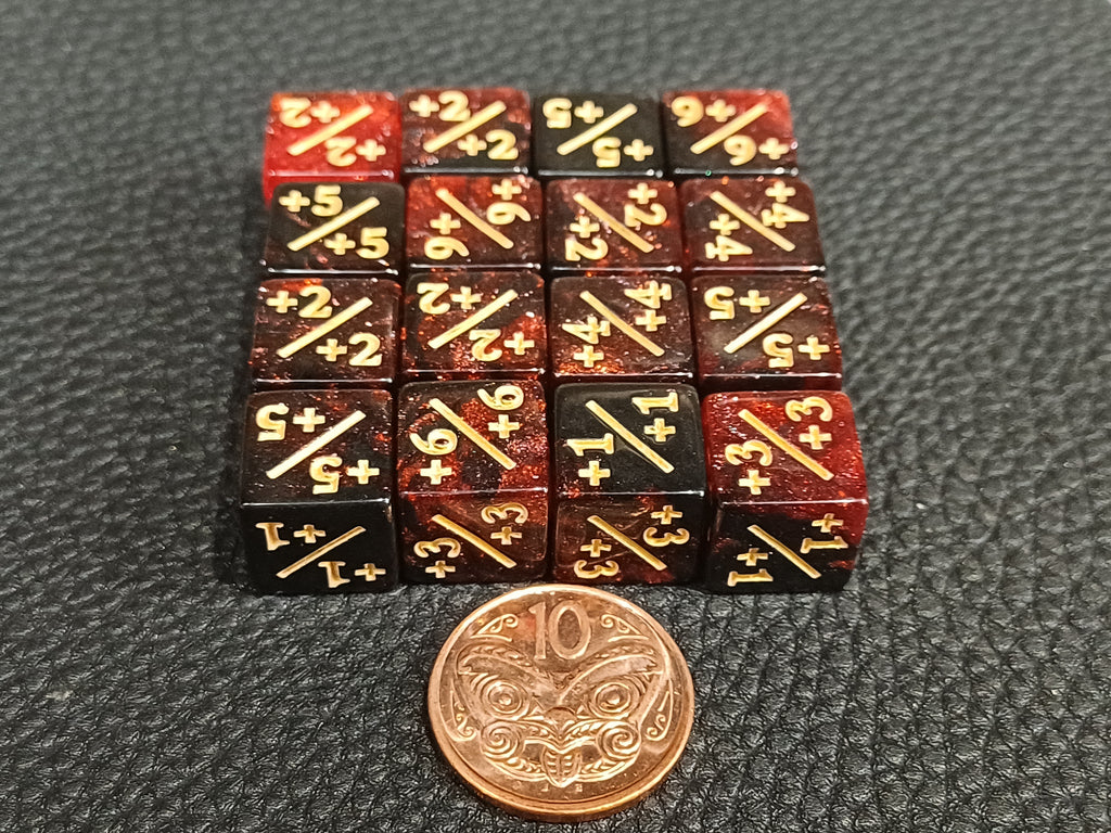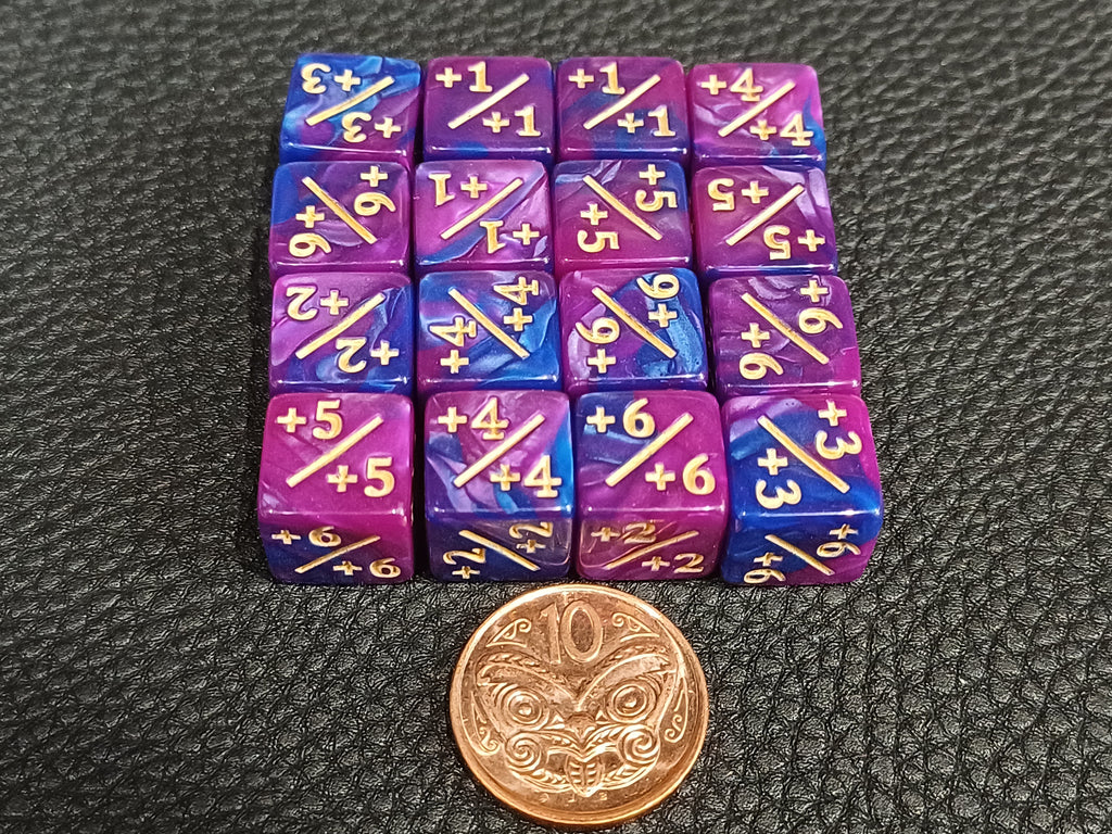 Streamline your Magic: The Gathering gameplay with this 16-pack of Positive 11mm Dice Counters, designed specifically for tracking +1/+1 counters, loyalty changes, and other in-game effects.